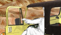 בחורה צעירה נוהגת בג'יפ ומתאפרת, היא דוהרת בין הקמטים על פרצופה של המדינה. היא מנופפת לשלום לפרצוף המקומט ומזנקת לפרצוף אחר. היא מגלה מייד שעל פרצוף אחר פניה הופכות לבבואת המקום ממנו הגיעה.